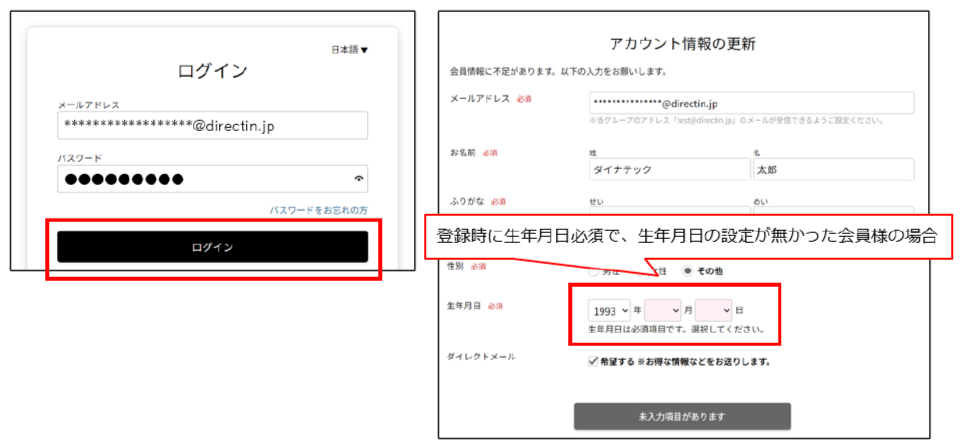必須情報の登録がない会員様の場合は、初回ログイン時に「アカウント情報の更新」画面が表示され、不足情報の修正を促されます。